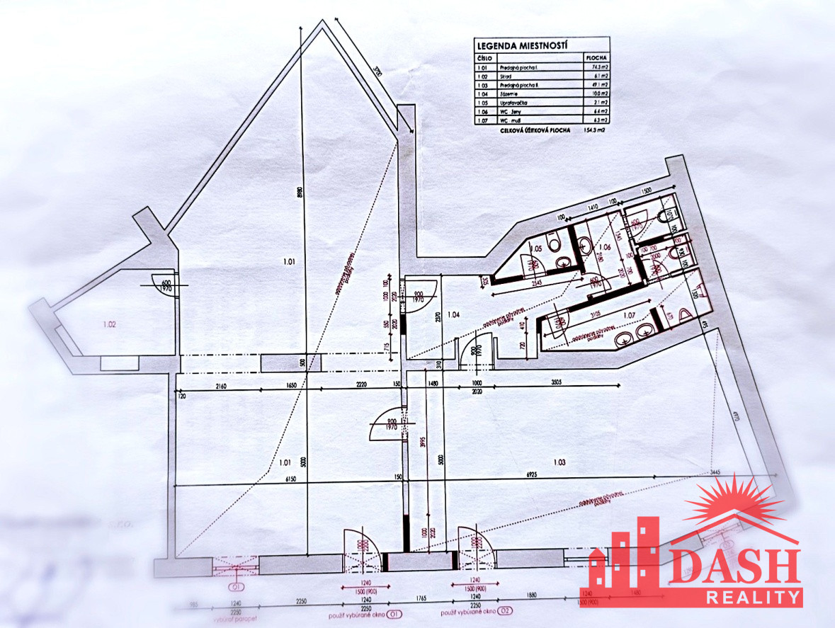 The total area of the space is 154 m2, it is divided into smaller rooms: sales area, warehouse, office, women's and men's toilets.