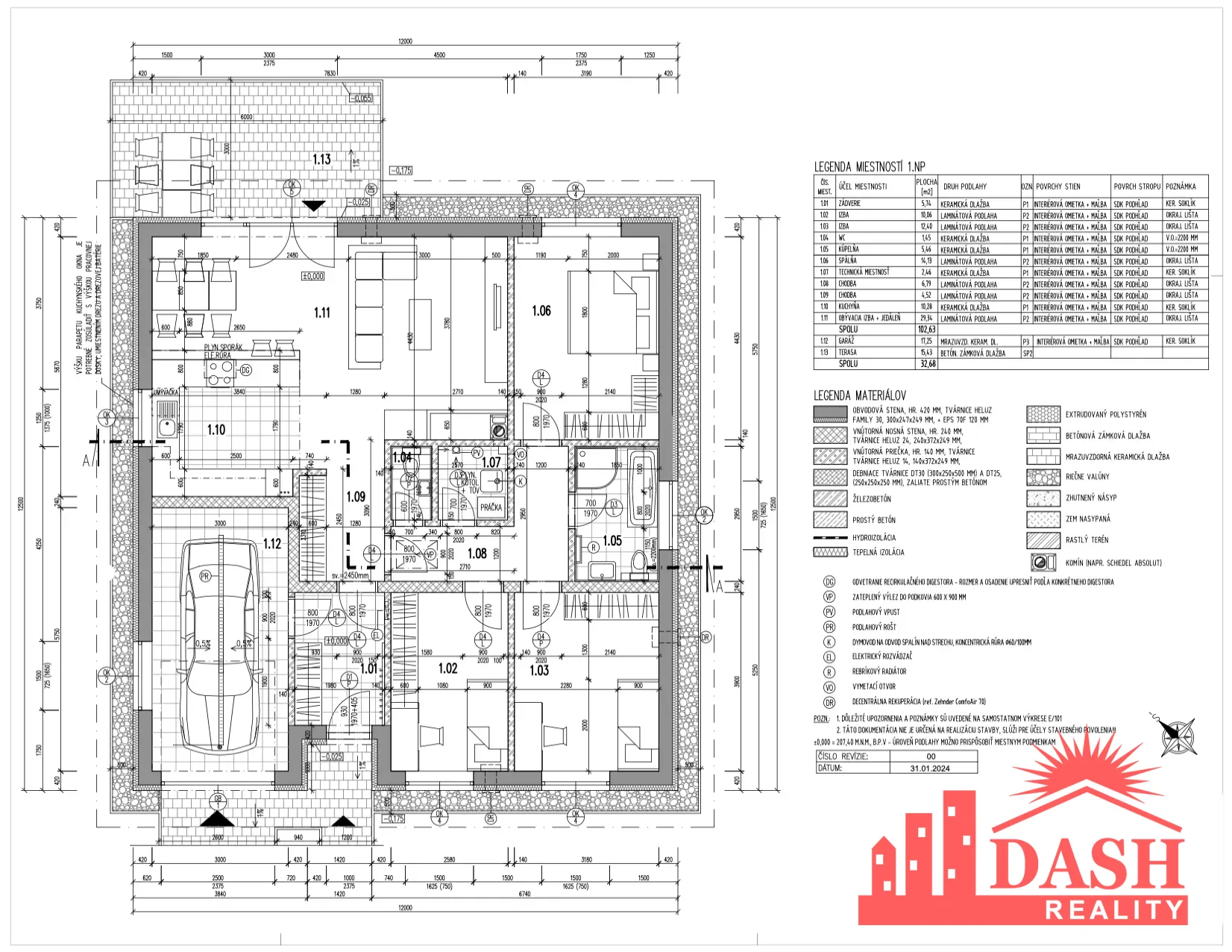 Dispozične je dom riešený vstupnou predsieňou s prechodom do garáže, tromi samostatnými izbami a priestrannou obývacou miestnosťou prepojenou s kuchyňou a jedálňou, kde je predpríprava na krb. Súčasťou domu je kúpeľňa s predprípravou na vaňu aj sprchovací kút spolu s WC, samostatné WC, technická miestnosť, chodba, výstup na terasu a garáž pre jedno auto. Nad technickou miestnosťou sa nachádza povalový úložný priestor o výmere 15 m². Pred garážou je možné parkovanie ďalších dvoch osobných áut.